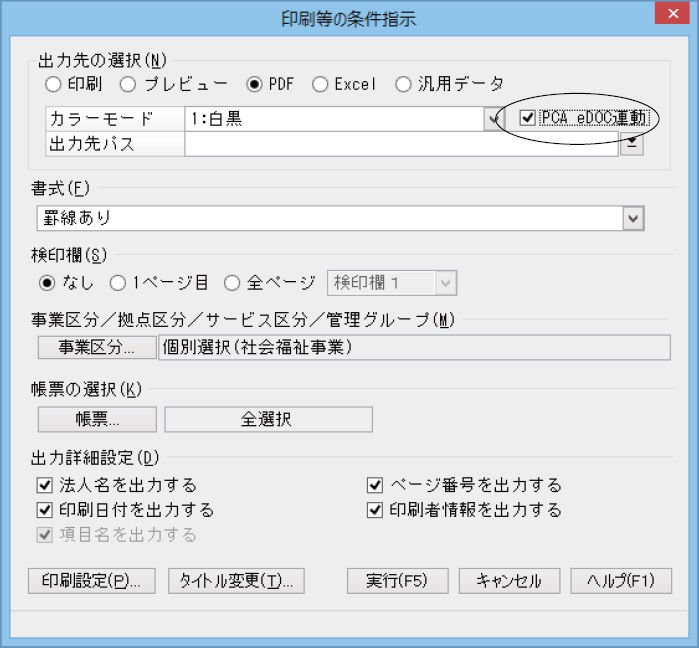 (1)  「印刷等の条件指示」画面等の「出力先の選択」で「PDF」を選択し、「PCA eDOC連動」にチェックマークを付けて出力を実行します。