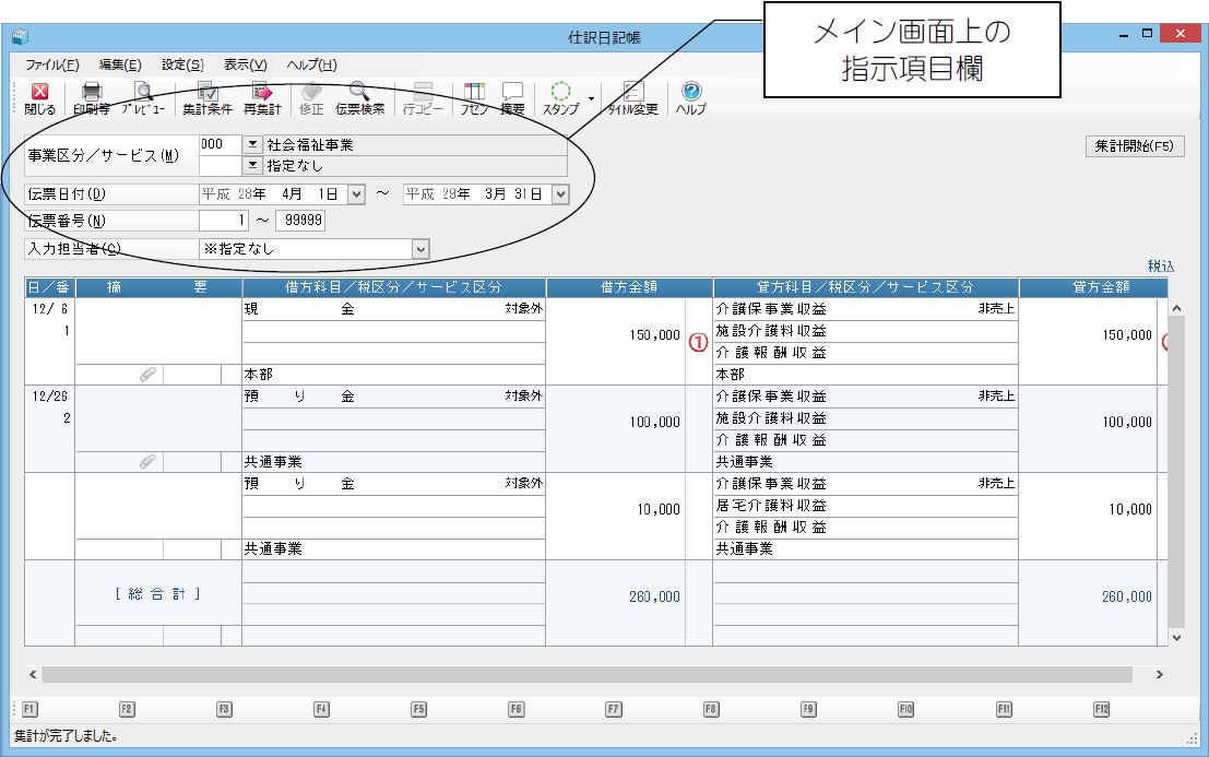 (1)  「条件指示」「印刷等の条件指示」画面で集計範囲等を指定します。指示できる項目は処理によって異なります。項目の説明は、「共通操作」-「条件指示項目のまとめ」をご覧ください。