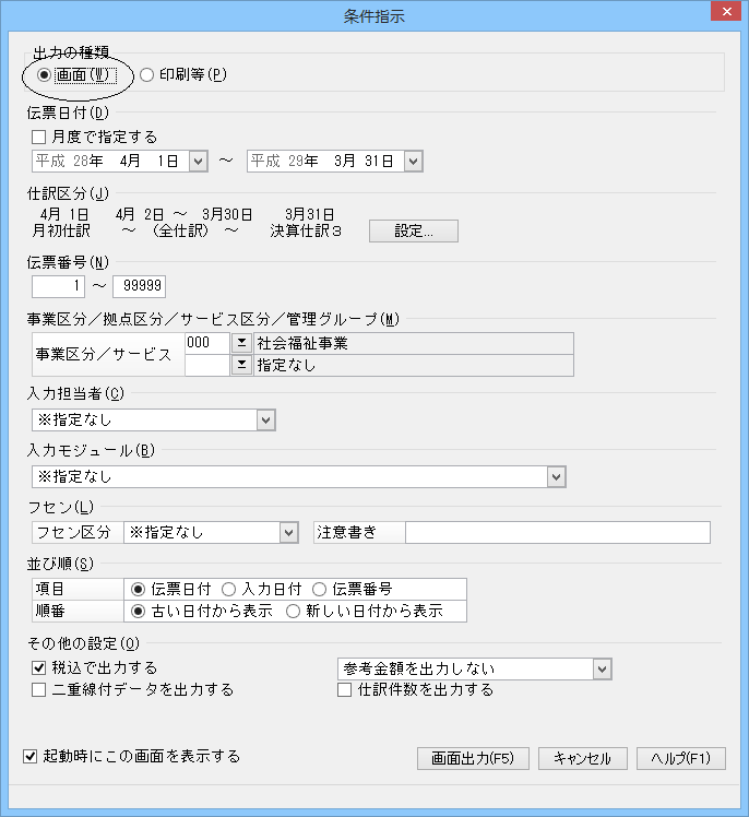 ツールバーの[集計条件]ボタンをクリックすると、「条件指示」画面が表示され、詳細な条件指示を行うことができます。「出力の種類」で“画面”を選択し、[画面出力]ボタンをクリックします。