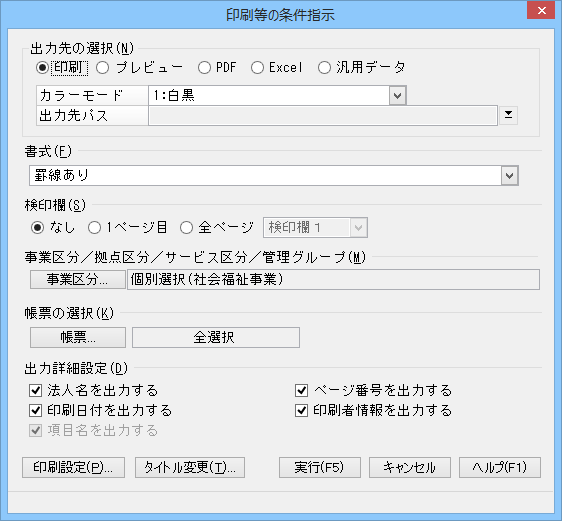 条件指示後、「出力先の選択」で「印刷」「プレビュー」等を選択し、[実行]ボタンをクリックします。