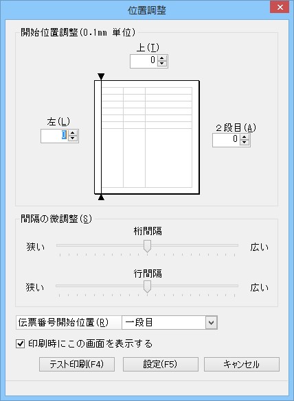 専用用紙への印刷の都度、「位置調整」画面を表示させたい場合にチェックマークを付けます。