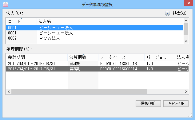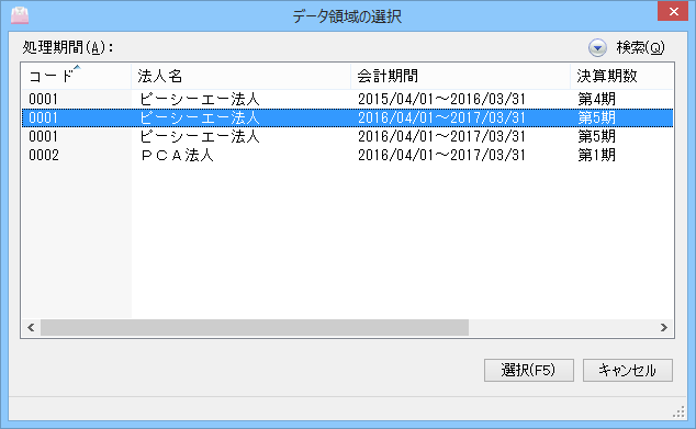 「設定」-「メニュープロパティ」-「その他」の「データ領域の選択時に法人別リストを表示する」のチェックマークを外すと、法人と処理期間をまとめて一覧で表示することができます。