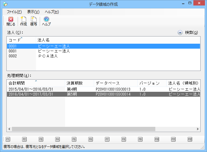 既存のデータ領域を複写することもできます。登録済みのデータ等は複写先にコピーされます。