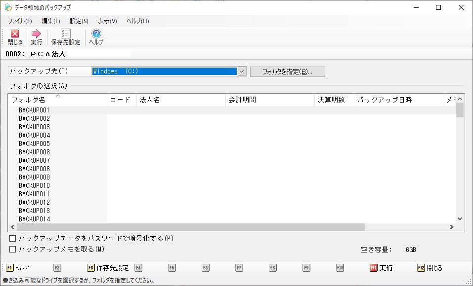 メニューの「ファイル」-「データ領域のバックアップ」を選択すると、以下のような画面が表示されます。
