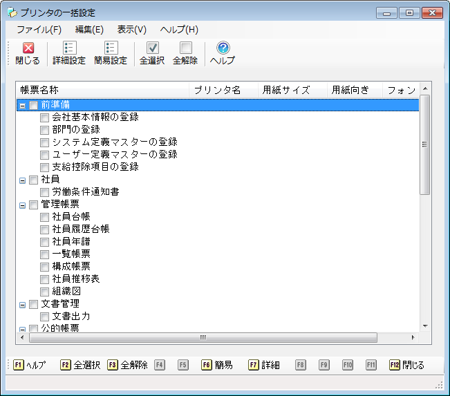 メニューの「ファイル」-「プリンタの一括設定」を選択すると、以下のような画面が表示されます。