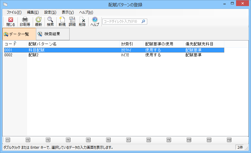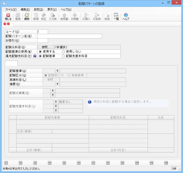 メニューの「前準備」-「配賦パターンの登録」を選択すると、以下のような画面が表示されます。