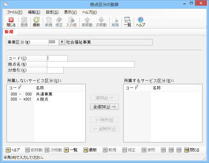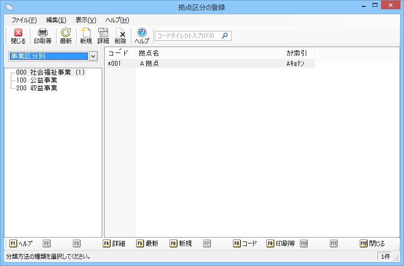 メニューの「前準備」-「拠点区分)の登録」を選択すると、以下のような画面が表示されます。