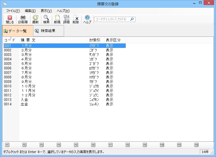 メニューの「前準備」-「摘要文の登録」を選択すると、以下のような画面が表示されます。