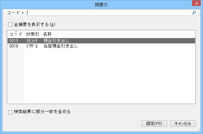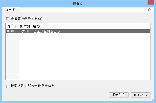 (1) 借方科目に”111:現金”が入力されている状態で、摘要欄の参照ウィンドウを開くと、以下のように表示されます。