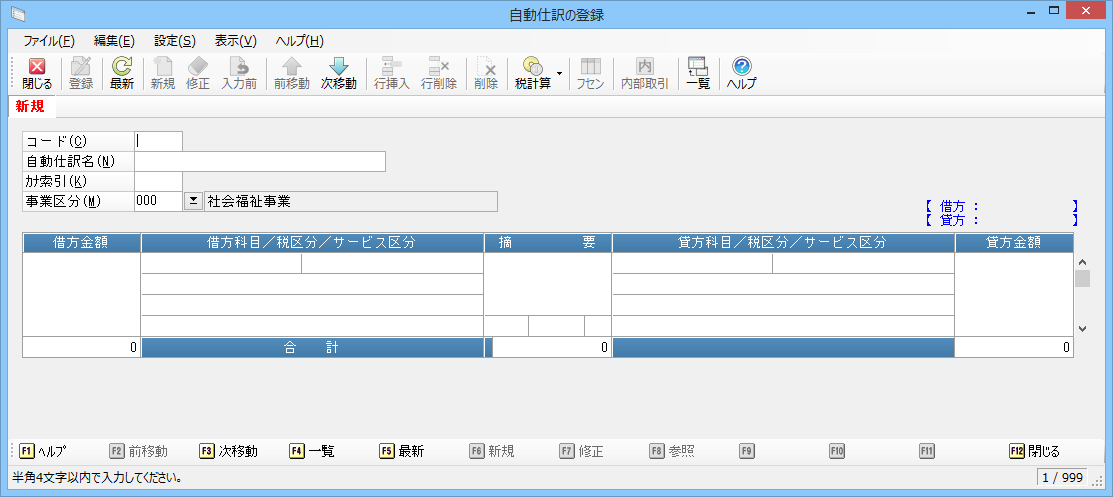 明細に勘定科目が一つも設定されていない状態で自動仕訳を登録することはできません(金額のみ、事業区分/サービス区分のみ入力している場合など)。