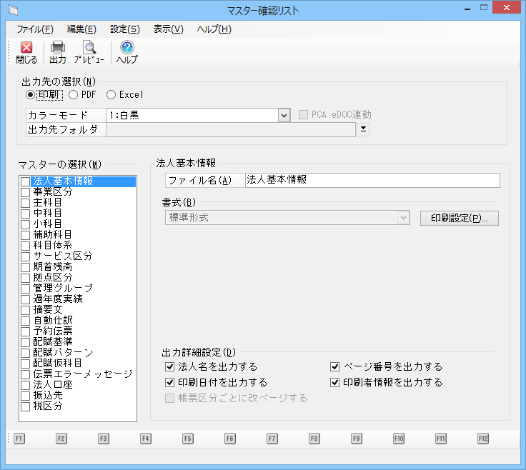 前準備で登録した内容を確認するための各リストを項目別に印刷、ファイル(PDF、Excel)出力します。