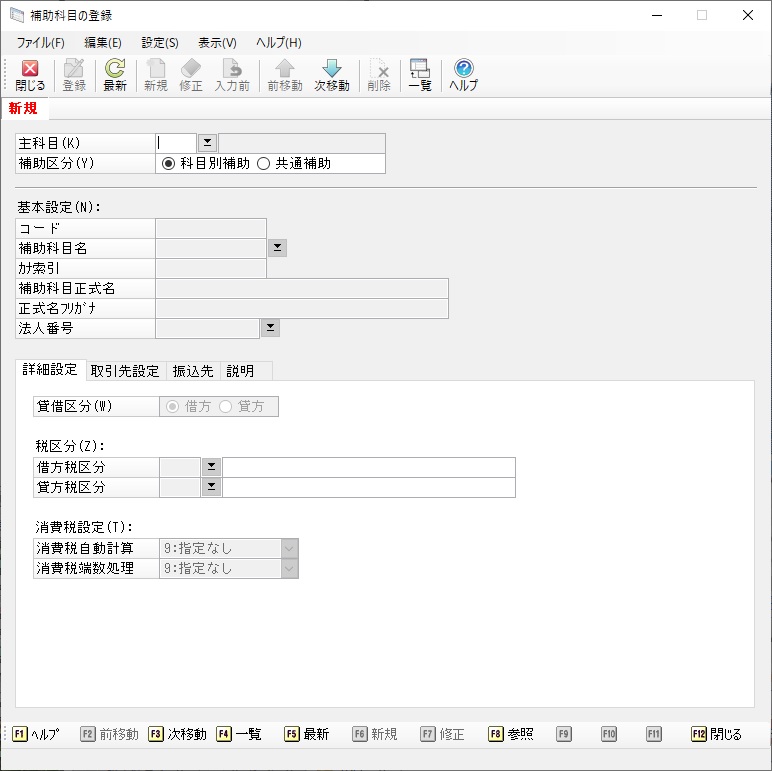 メニューの「前準備」-「科目の登録」-「補助科目の登録」を選択すると、以下のような画面が表示されます。