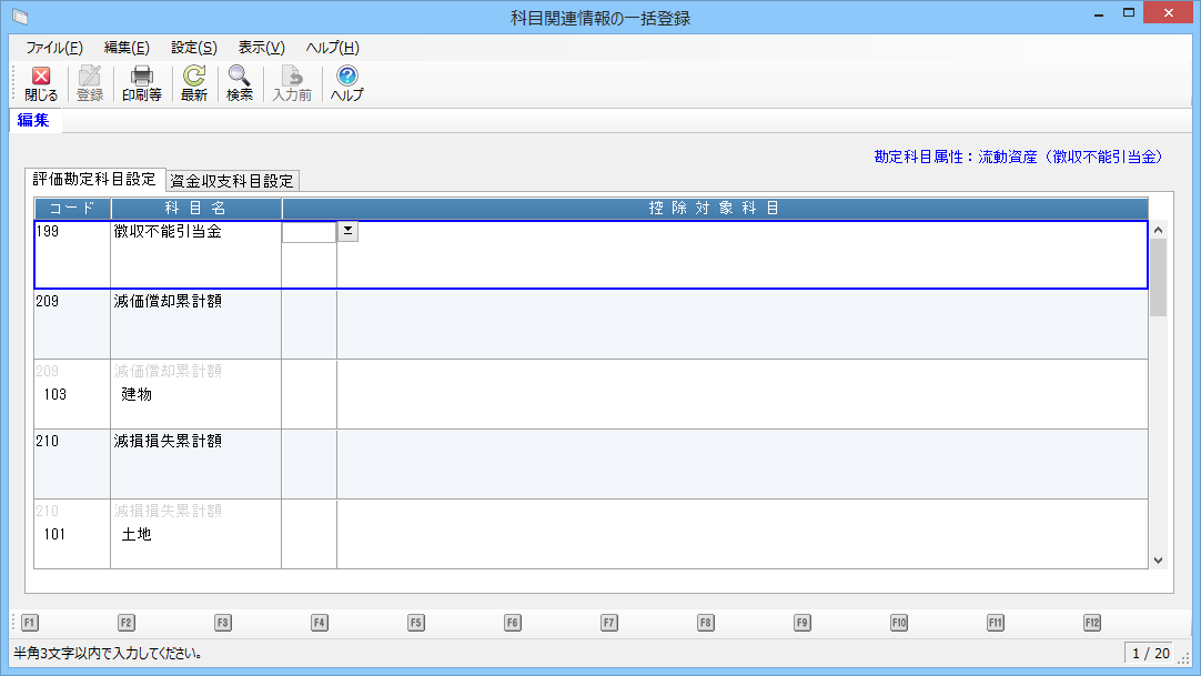 主科目、補助科目、中科目、小科目の関連情報を一括登録できます。
