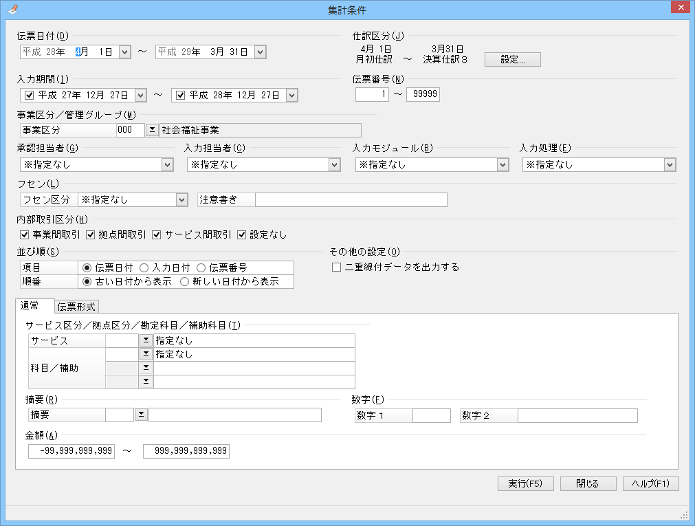条件を指定して仕訳伝票を検索します。条件に該当する仕訳の明細が表示され、追加・修正・削除ができます。検索結果を印刷することもできます。