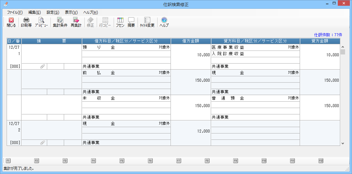 メニューの「データ入力」-「仕訳検索修正」を選択すると、次のような画面が表示されます。