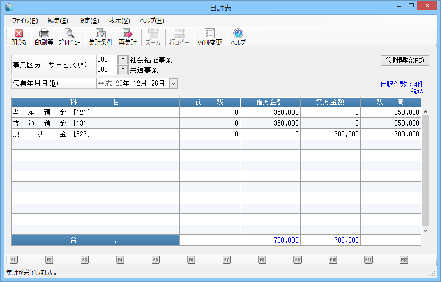 一日分の取引を勘定科目ごとに貸借の発生額で集計し、表示・印刷します。