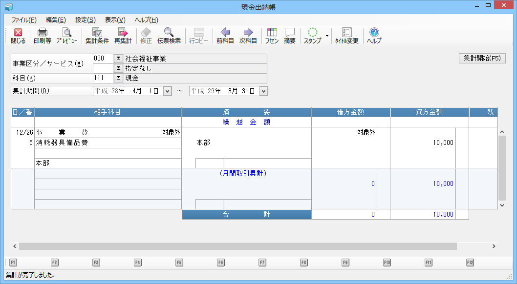 メニューの「日常帳票」-「現金出納帳」を選択すると、以下のような画面が表示されます。