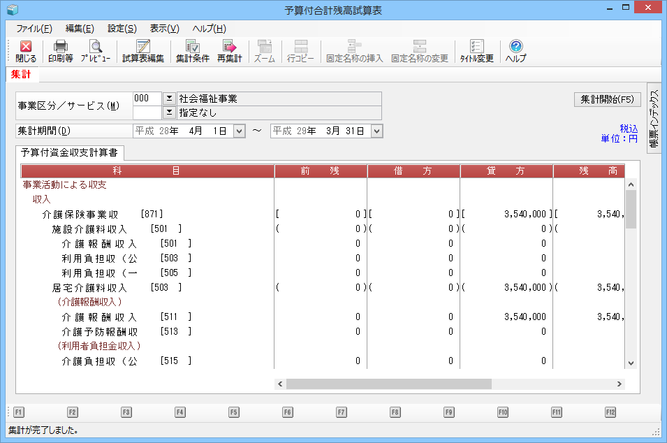 合計残高試算表に予算額と予算残額を併記した、予算付合計残高試算表を表示・印刷します。