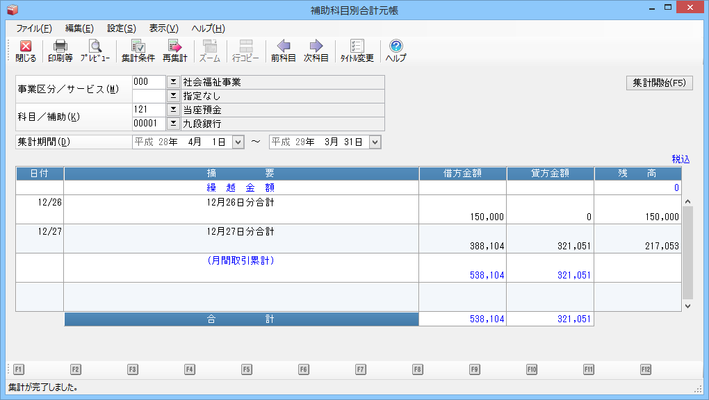 補助科目ごとに一日分・一月分の取引の合計額を表示・印刷します。