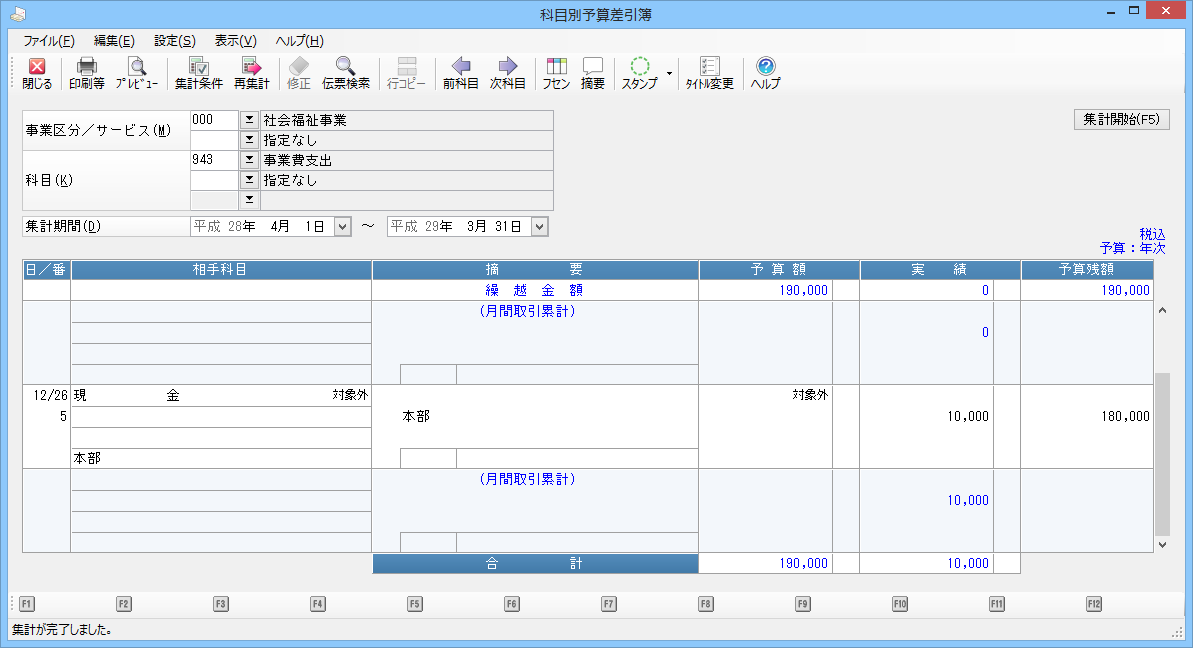 仕訳された取引と予算を勘定科目別にまとめた帳簿を表示・印刷します。