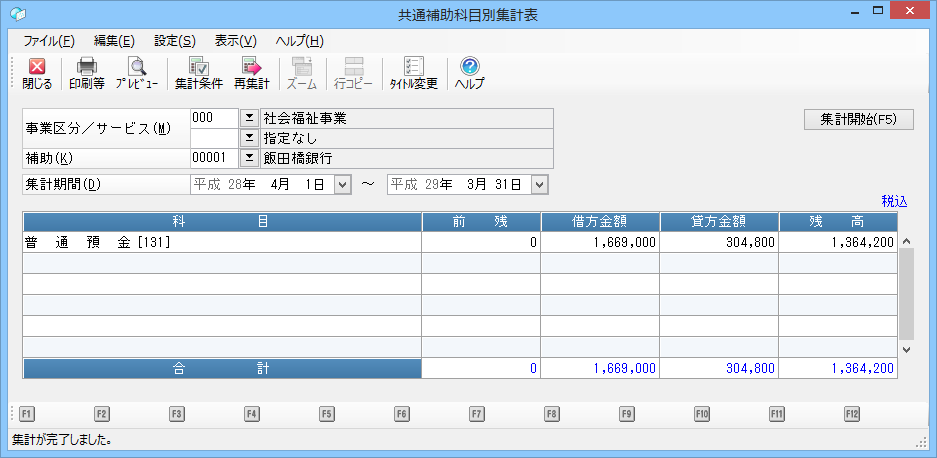 補助科目ごとに勘定科目を集計し、科目ごとに貸借発生・残高を表示、印刷を行います。