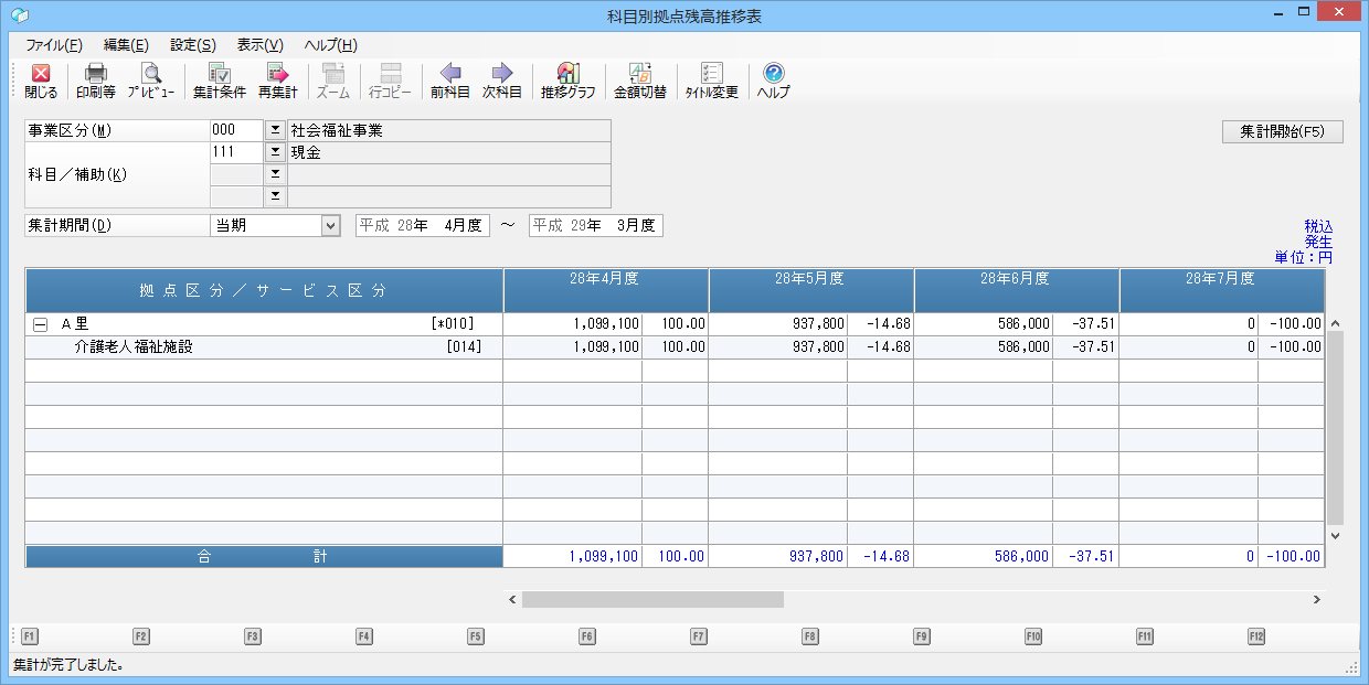 指定された科目の仕訳データを、拠点区分(サービス区分)ごとに集計し月次推移表を表示・印刷します。
