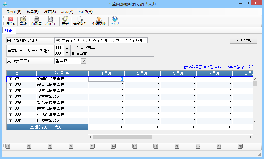 メニューの「内部取引」-「予算内部取引消去調整入力」を選択すると、以下のような画面が表示されます。