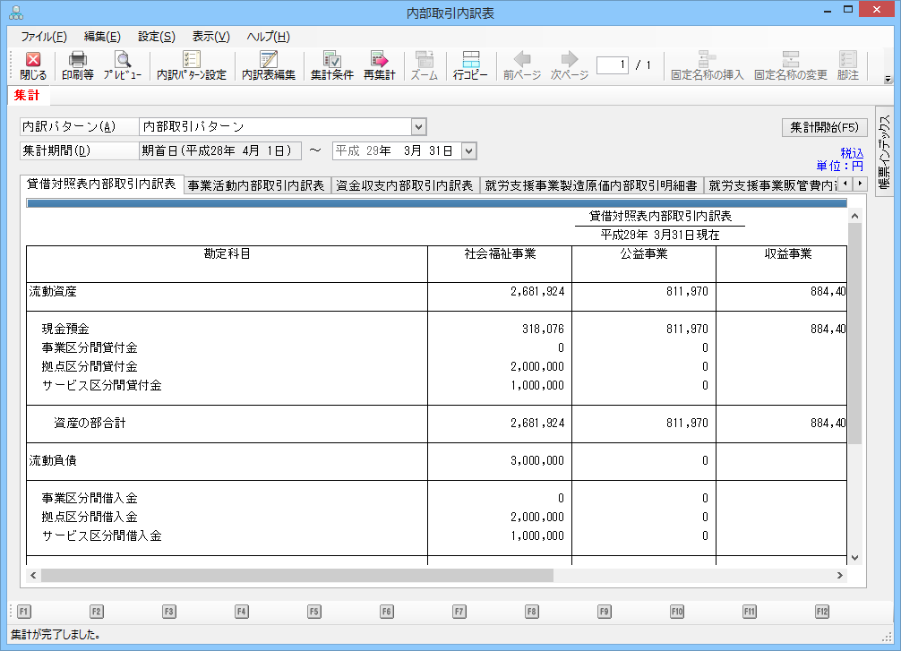 貸借対照表内部取引内訳表、事業活動内部取引内訳表、資金収支内部取引内訳表、就労支援事業製造原価内部取引明細書、就労支援事業販管費内部取引明細書、授産事業費用内部取引明細書、資金収支予算内部取引内訳表