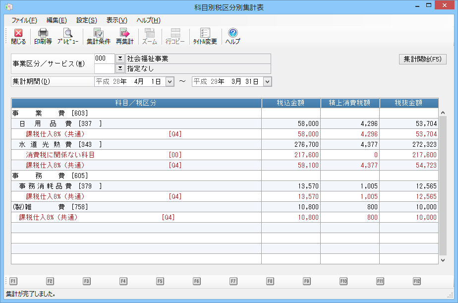 メニューの「決算処理」-「科目別税区分集計表」を選択すると、以下のような画面が表示されます。