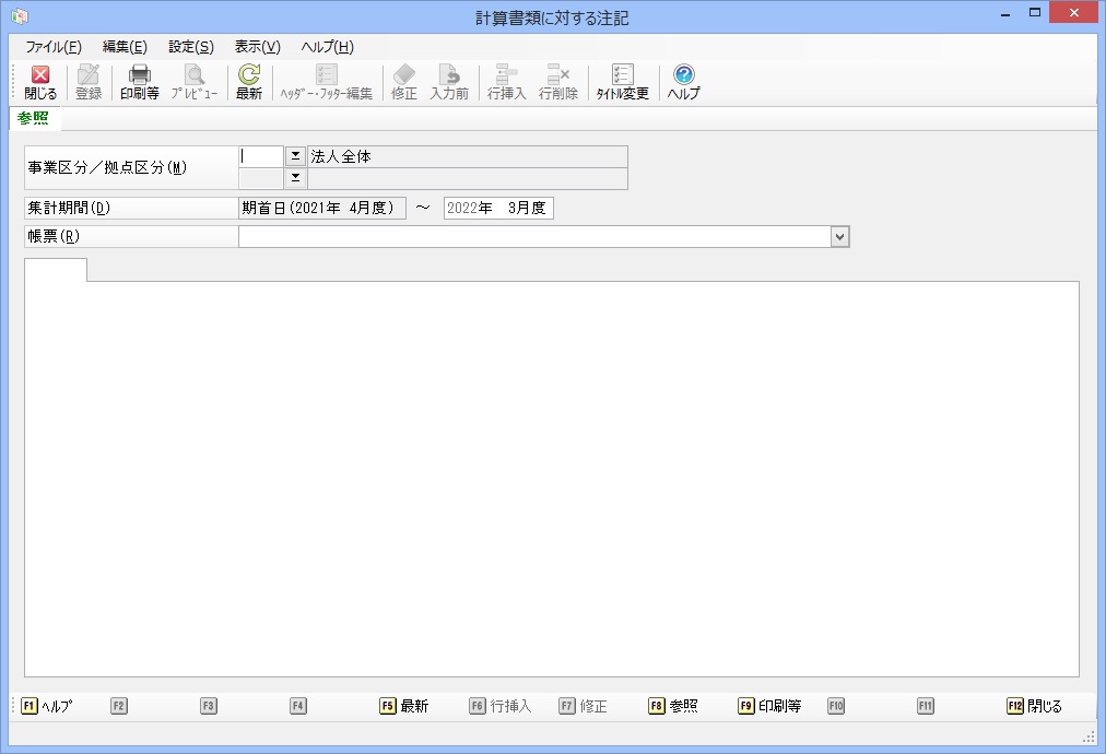 メニューの「決算処理」-「計算書類に対する注記」を選択すると、以下のような画面が表示されます。