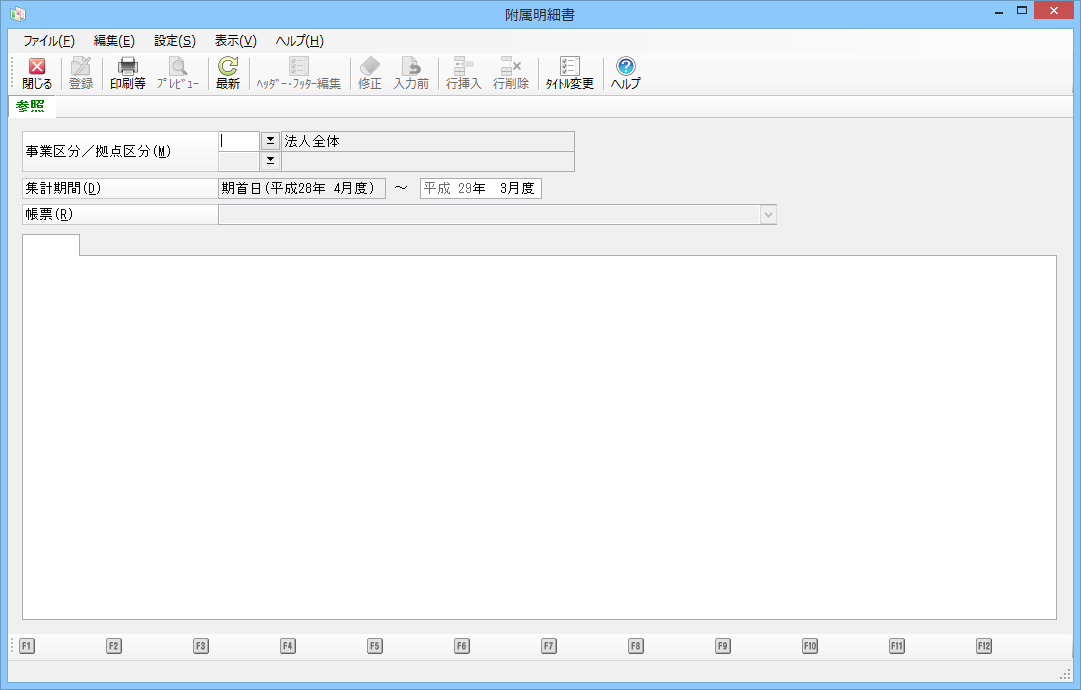 メニューの「決算処理」-「附属明細書」を選択すると、以下のような画面が表示されます。