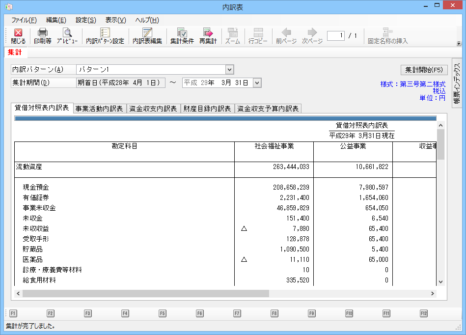 貸借対照表内訳表、事業活動内訳表、資金収支内訳表、財産目録内訳表、資金収支予算内訳表