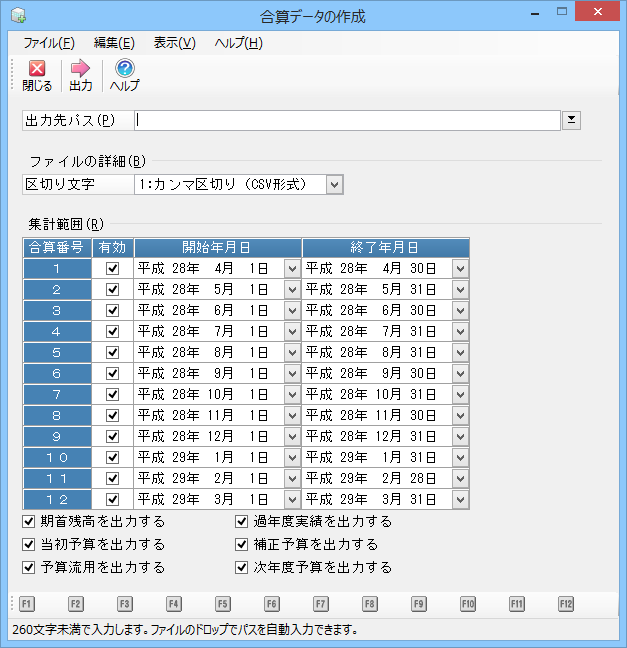 メニューの「合算処理」-「合算データの作成」を選択すると、以下のような画面が表示されます。