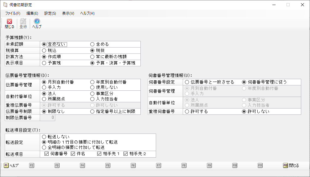 メニューの「伺書」-「伺書初期設定」を選択すると、以下のような画面が表示されます。