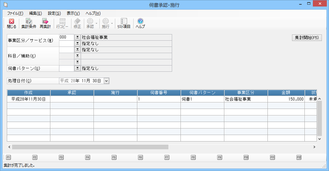 メニューの「伺書」-「伺書承認・施行」を選択すると、以下のような画面が表示されます。