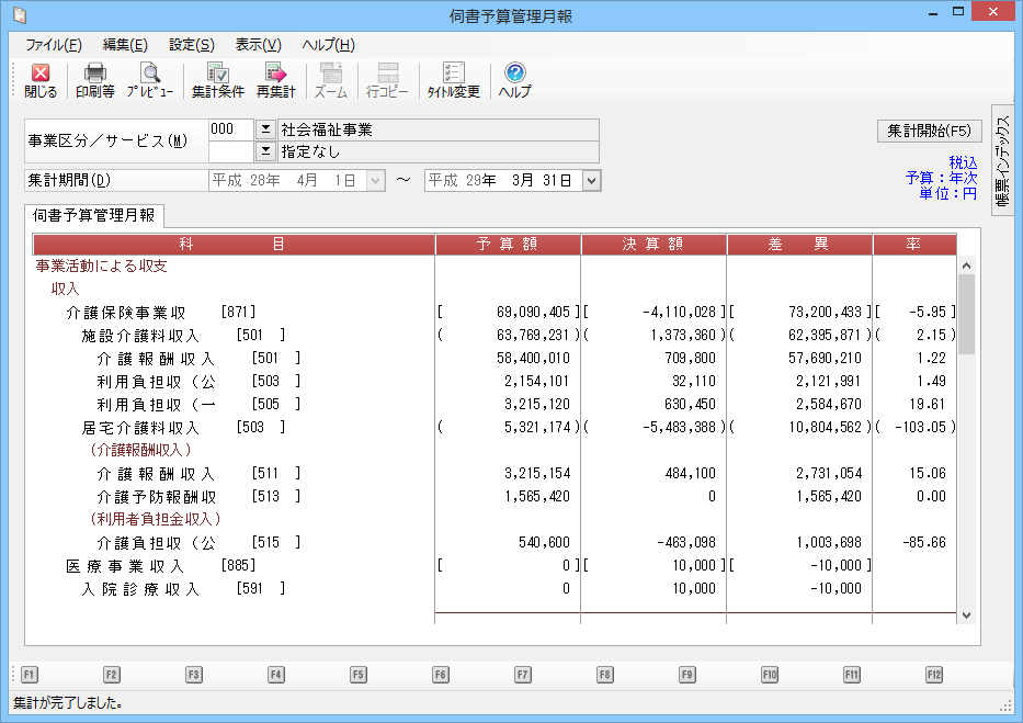 資金収支科目の予算額、決算額(伺書金額を含む)、差異、率を一覧で表示・印刷します。