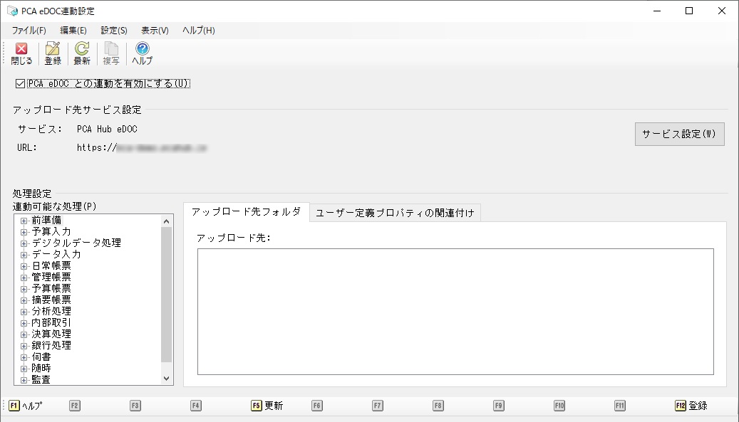 メニューの「随時」-「PCA eDOC連動設定」を選択すると、以下のような画面が表示されます。