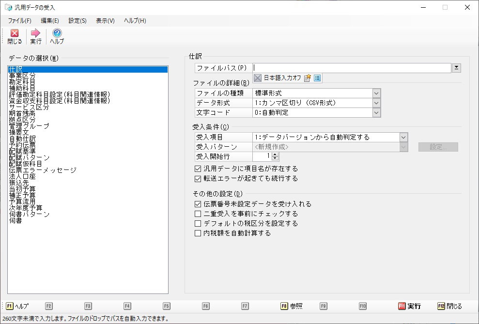 指定した形式と合致する仕訳、前準備の各マスター、予算の汎用データを受け入れます。