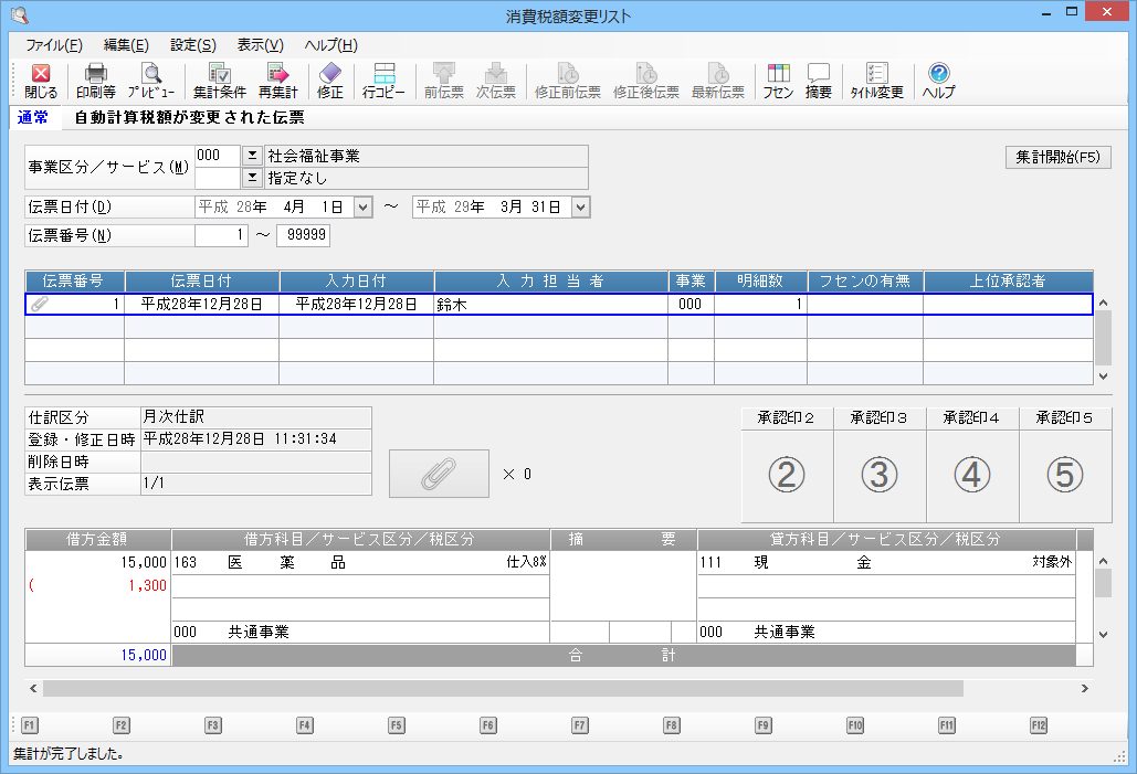メニューの「監査」-「消費税額変更リスト」を選択すると、以下のような画面が表示されます。