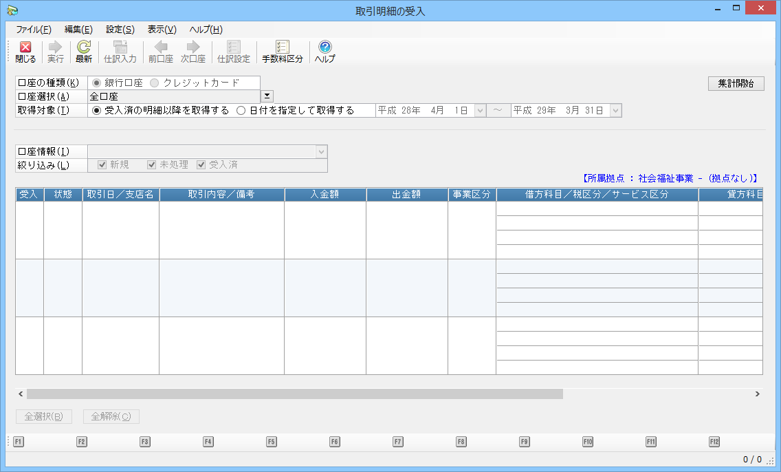 メニューの 「デジタルデータ処理」-「FinTechサービス」-「取引明細の受入」を選択すると、以下のような画面が表示されます。
