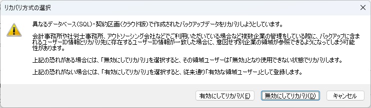 この恐れがある場合には、リカバリ時にメッセージを表示して、重複ユーザーを「無効」としてリカバリすることができます。