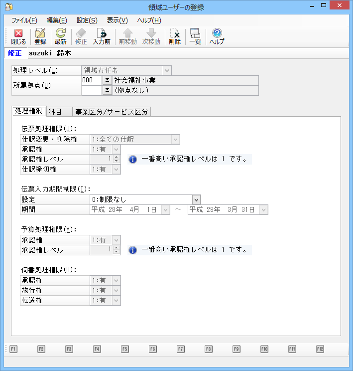 領域ユーザーに対して、処理レベルと処理可能な事業区分/サービス区分、科目、その他の権利を設定します。