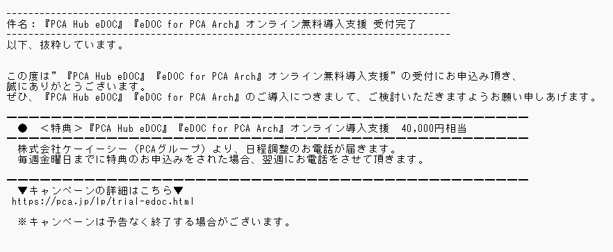1回4万円相当(2時間×1回)の『PCA Hub eDOC』、または『eDOC for PCA Arch』のオンライン導入支援無料でプレゼントいたします。