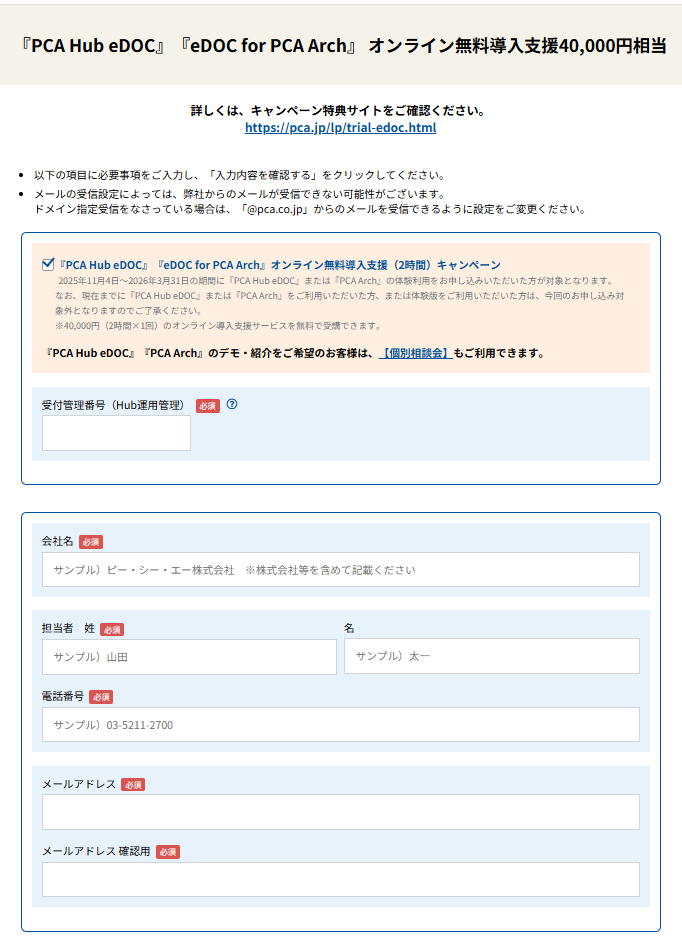 本キャンペーンへの申込みは『PCA Hub eDOC』『eDOC for PCA Arch』の体験利用が必要になります。下記リンクよりお申し込みください。