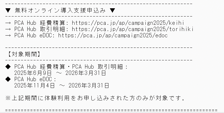 - ※本キャンペーンは2025年10月1日~2026年3月31日の期間に、『PCA Hub 経費精算』または『経費精算 for PCA Arch』の体験利用をお申し込みいただいた方が対象となります。現在までに『PCA Hub 経費精算』または『経費精算 for PCA Arch』をご利用いただいた方、または体験版をご利用いただいた方は、今回のお申し込み対象外となりますのでご了承ください。その他、キャンペーン注意事項は下記をご確認ください。