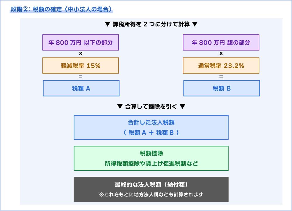 中小法人(資本金1億円以下など一定の要件を満たす法人)の場合、年800万円以下の部分には軽減税率が適用され、それを超える部分には通常税率が適用されます。