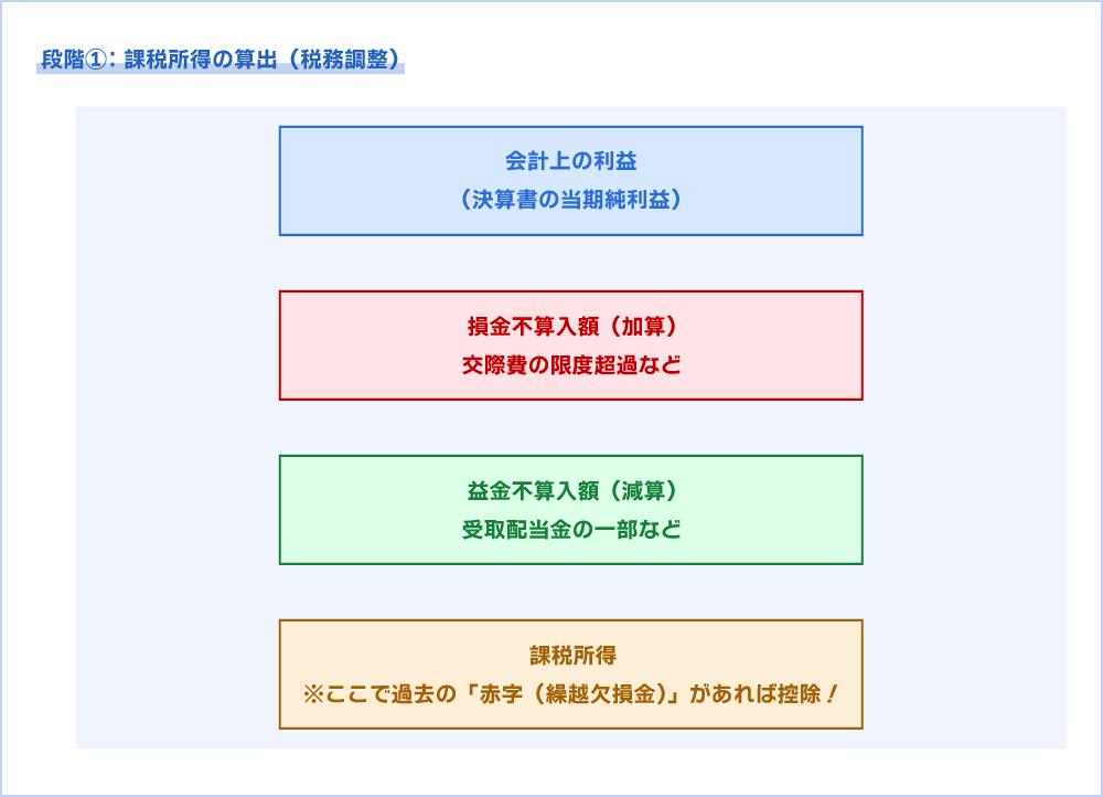 まずは、会計上の利益に税務調整を加え、課税所得を算出します。