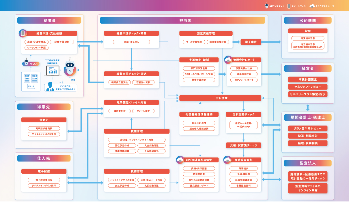 財務経理業務を効率化したい企業様向けクラウド会計サービス。AI活用で業務の自動化・共有化を実現し、経費精算や固定資産、債権債務管理などの業務もオールインワンで利用できます。