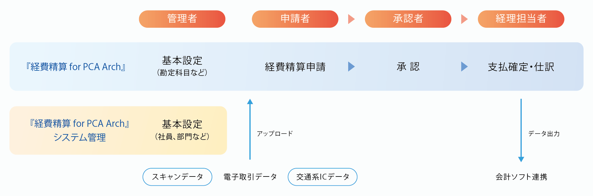『経費精算 for PCA Arch』を利用すれば、従業員が業務上でかかった交通費、出張旅費、交際費、物品購入費等の経費をシステム上で直接申請できます。申請は承認者によって承認され、経理担当者が確認後、会計ソフトに仕訳連携を行うことが可能です。さらに、『経費精算 for PCA Arch』には、交通系ICカードとのデータ連携機能や、スマートフォンを用いて領収書を撮影し申請を起票する機能も搭載しています。これにより、紙やExcelでの伝票起票と精算を行う従来の方法と比べて、経費精算業務を大幅に効率化することができます。