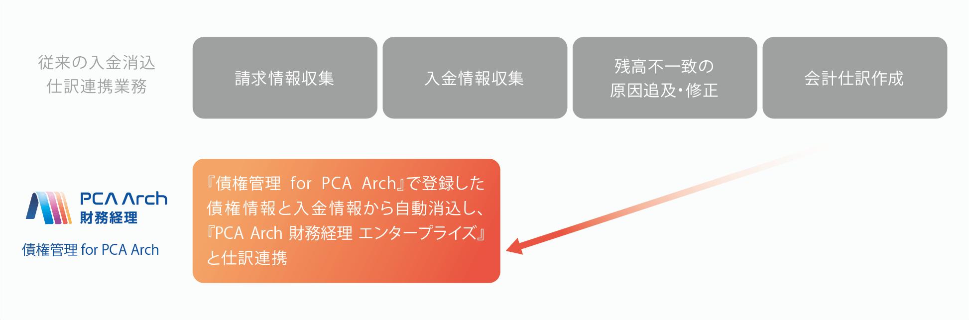 『債権管理 for PCA Arch』でEBデータを受け入れることで回収伝票が作成されます。回収予定の情報と回収情報を自動的に突き合わせて消込処理が可能です。また、回収伝票をもとに『PCA Arch 財務経理 エンタープライズ』に仕訳データとして連動することもできます。